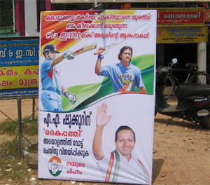 'കങ്കാരുക്കളെ തകര്ത്ത്, പാകിസ്ഥാനെ തുരത്തി ലങ്ക കീഴടക്കാനൊരുങ്ങുന്ന ടീം ഇന്ത്യയ്ക്ക് അരൂരിന്റെ ആശംസകള്' എന്ന കുറിപ്പും മുകളില് ആലേഖനം ചെയ്തിട്ടുണ്ട്. അടിയില് 'കൈ' ഉയര്ത്തി നില്ക്കുന്ന ഷുക്കൂറിന്റെ പടവും വോട്ടഭ്യര്ഥനയും ഉണ്ട്. മണ്ഡലത്തിന്റെ വിവിധഭാഗങ്ങളിലായി അമ്പതോളം ഫ്ലക്സുകളാണ് ഇത്തരത്തില് സ്ഥാപിച്ചിട്ടുള്ളത്.
